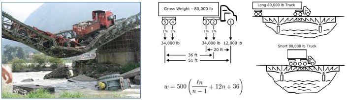 미국은 1974년 교량통과하중공식(Federal Bridge Formula)을 법제화하고 트럭의 “중량 대 길이”를 제한하여트럭 바퀴축의 집중하중이 교량부재에 과도한 응력이 발생하는 것을 방지하고 있다. 과적차량도 엄중 단속하고 있는데 차량 중량검사소(weigh station)를 운영하고 위반 적발 시 벌금을 부과할 뿐만 아니라 주에 따라서는 적발 시 초과하중을 허용하중 이내로 현장에서 줄이도록 조치까지 하고 있다.