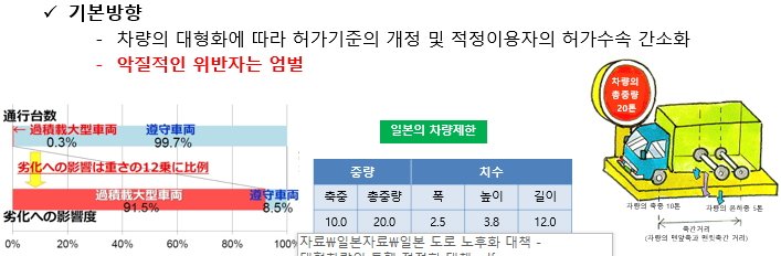 2014.4월 『도로의 노후화대책의 본격실시에 관한 제언』은 중량제한을 초과하는 대형차량에 대한 단속∙지도 강화 및 특수차량 통행허가제도의 심사기준 개정 및 심사의 신속화 등 개선방안을 제시하였고, 2014.5월, 국토교통성은 도로의 노후화대책에 따른 대형차량 통행의 적정화 방침을 수립∙시행하고 있다.